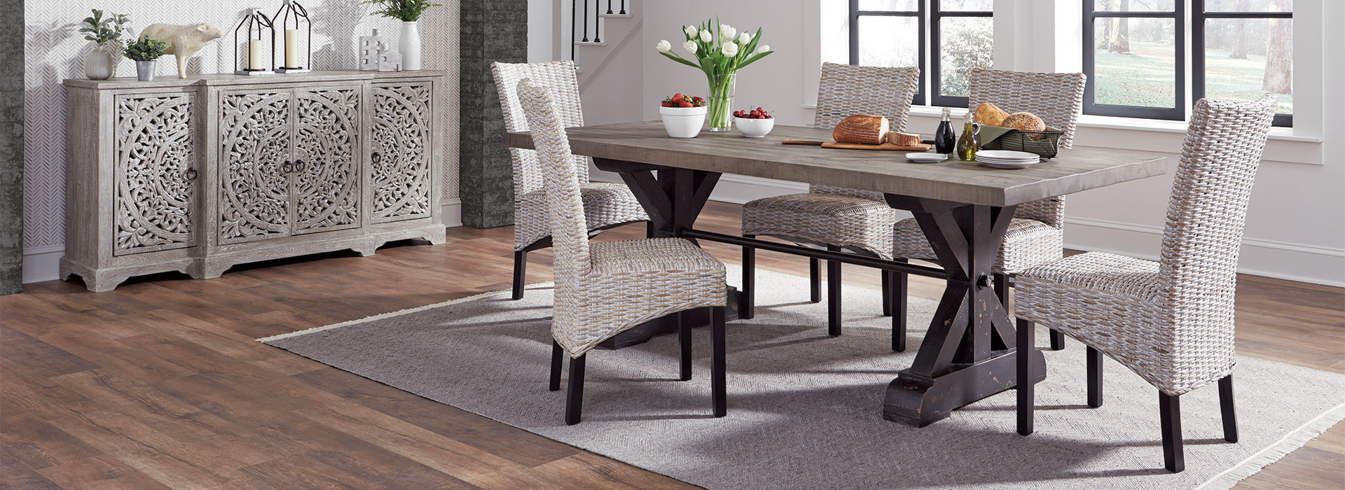 Keep tradition alive with dark stain wood pieces complemented by white accents. Craftsmanship is on fully display with reclaimed wood pieces featuring hand carved details.